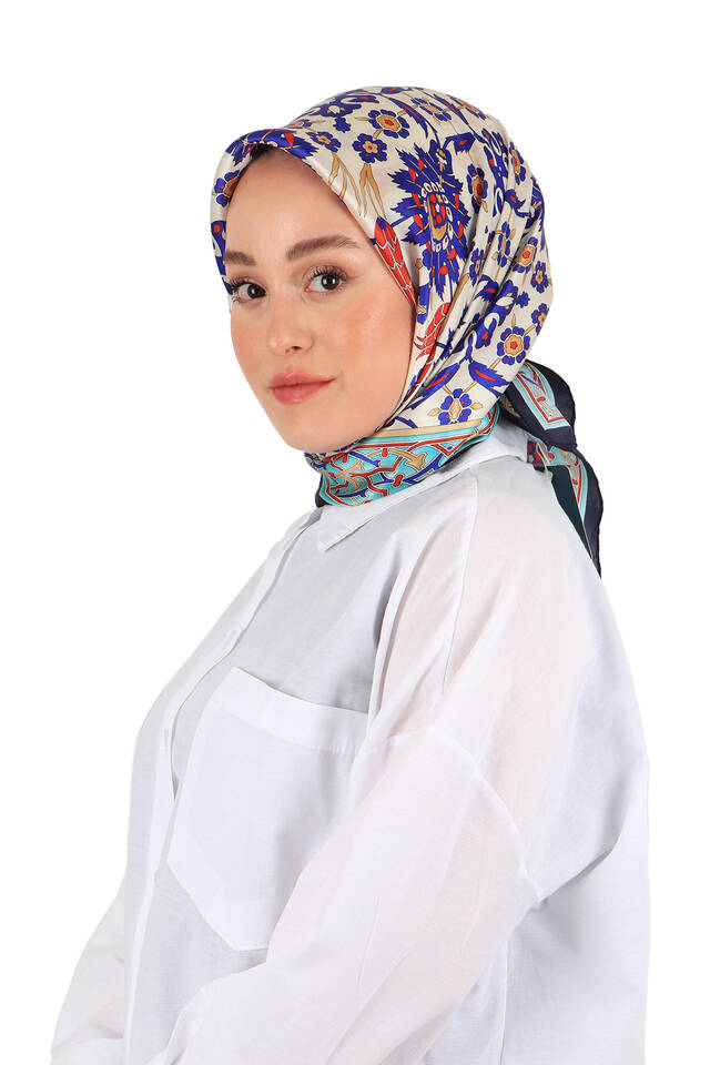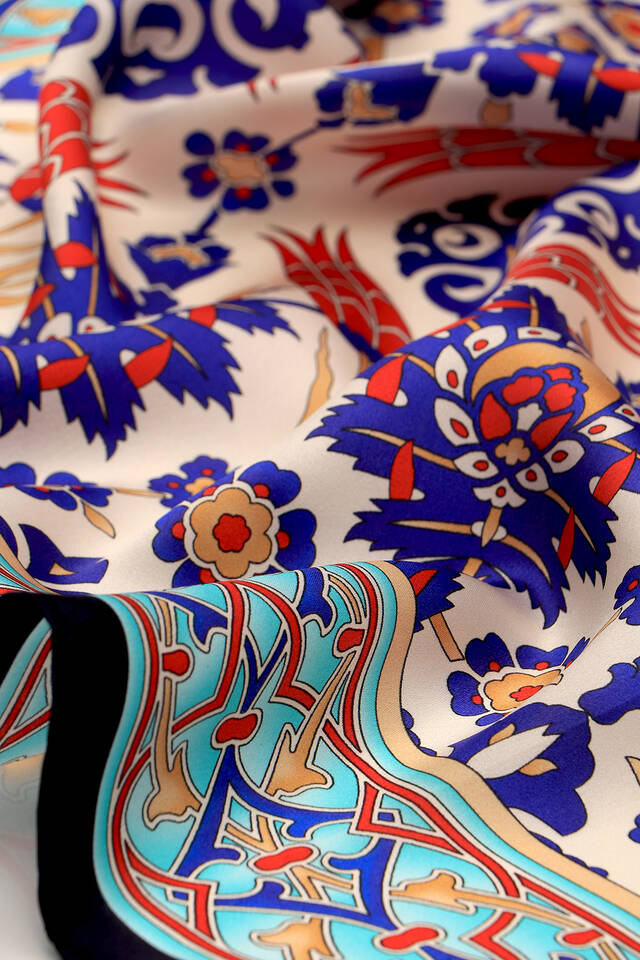 You, too, will feel the atmosphere of integrity in different beauty with the Dark Blue Saks Tile Tulip Pattern Sura Silk Square Scarf, reflected in the unique elegance of silk. Our product; It offers ease of use with its 100% silk content and dimensions of 90x90cm.
