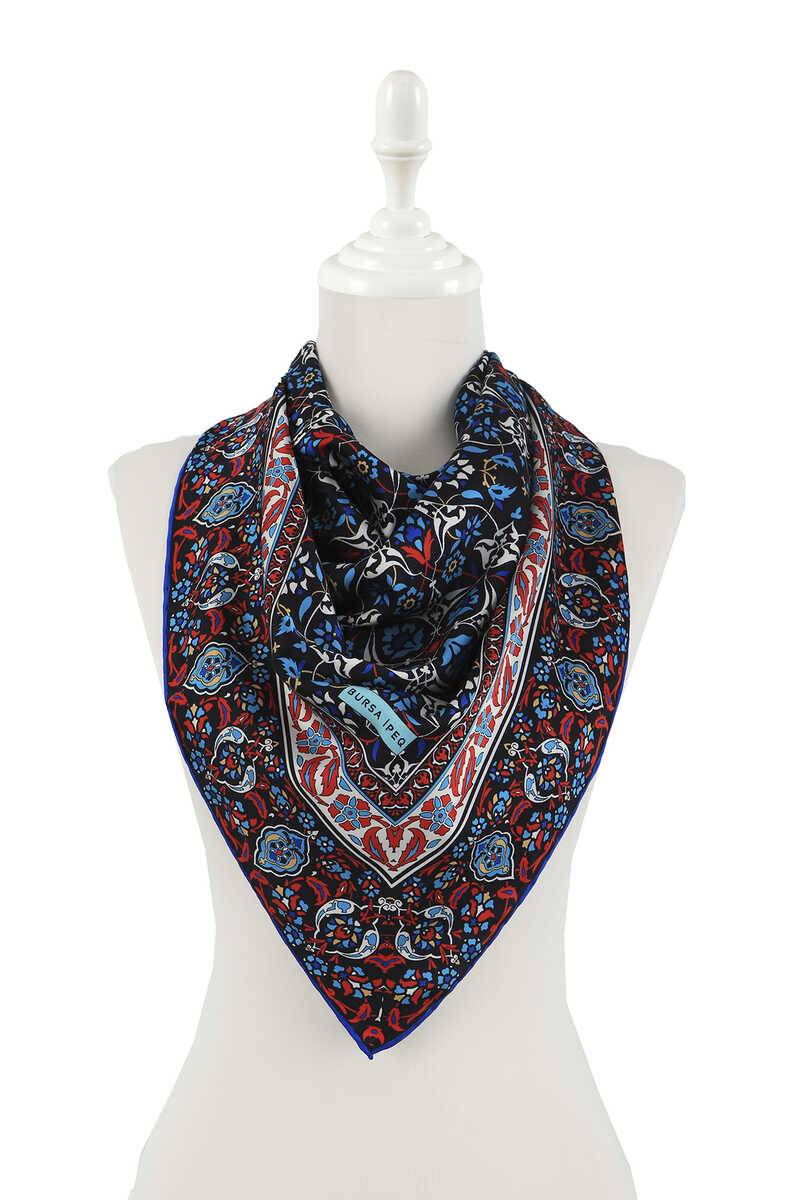 fun and classic choice where dark blue tile patterns come together with silky fabric texture and bright and vibrant colors… Add energy to life with the silky texture of flowers! Our product: 100% silky rayon fabric offers ease of use with its dimensions of 90x90 cm.