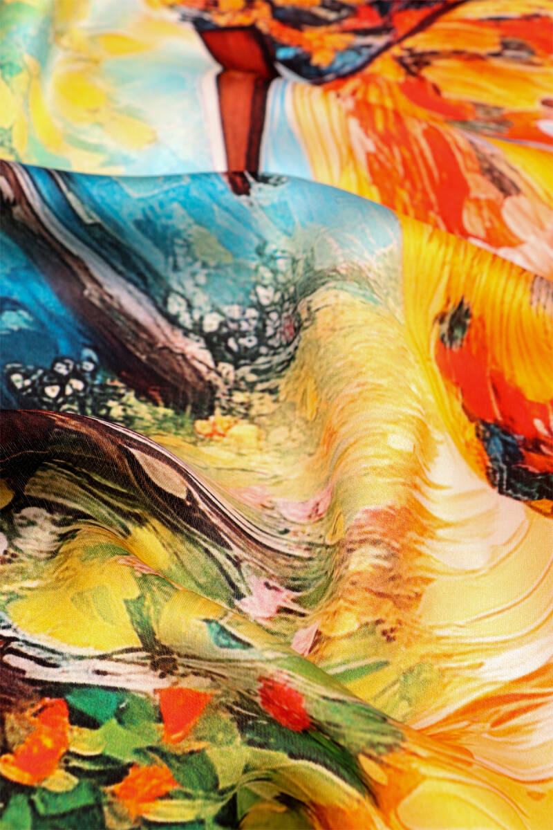 مع أنماط الغابة البرتقالية المنعكسة في أناقة الحرير الفريدة، ستشعر بأجواء جمالية فريدة. منتجنا، المصنوع من الحرير 100%، بأبعاد 55×55 سم، يوفر سهولة الاستخدام.