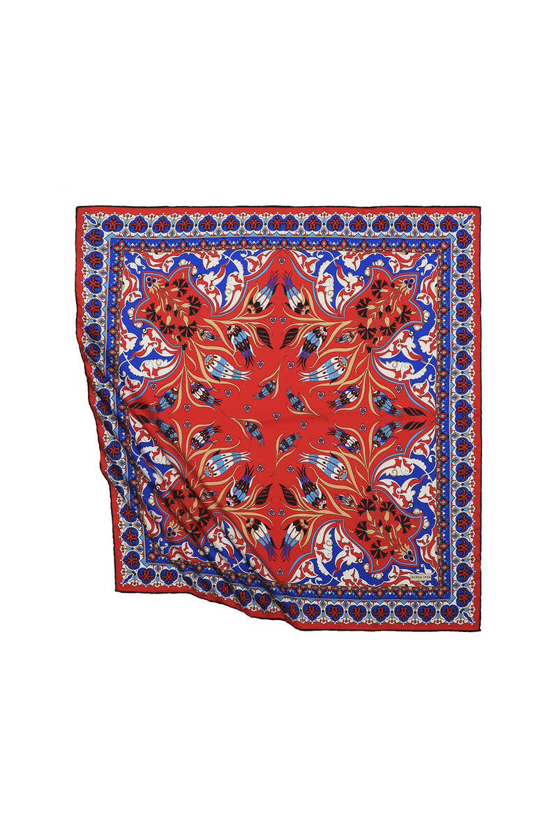 Red Cintemani Carnation patterns are a fun and classic choice where silky fabric texture and bright and lively colors come together... Add energy to life with the silky texture of flowers! Our product: 100% silky rayon fabric offers ease of use with its dimensions of 90x90 cm.