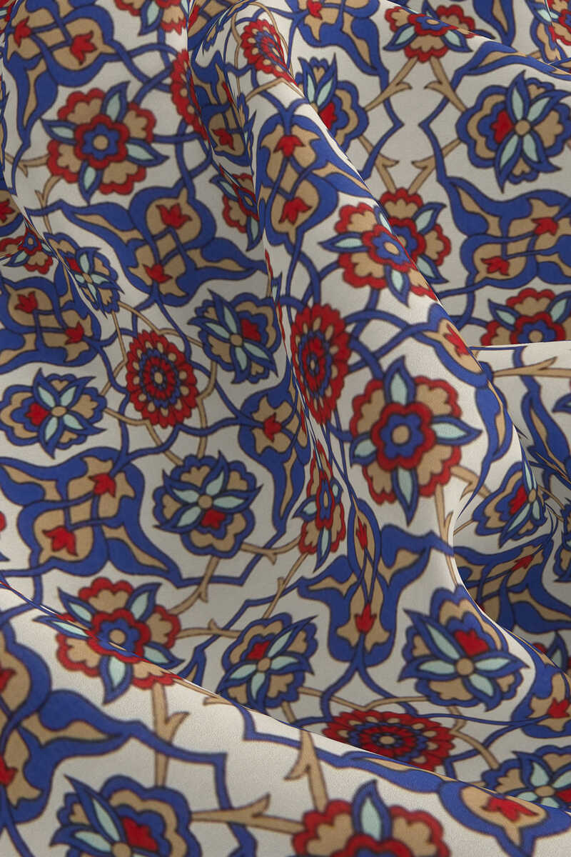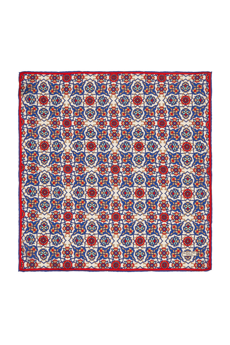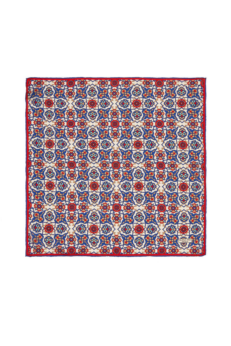 Geleneksel mirasımızın en özel desenleri modern yorumlar eşliğinde ipek ile buluşuyor.Kadınların vazgeçilmez tutkusu eşsiz dokumayla işlenen Türk Motifli Saks Gold renkli benzersiz Çini Sarmal desenli ipek mendil modelimiz; kalın, yumuşak ve ferah bir dokunuşla size hem konforu hem de gelenekselleşen şıklığı sunuyor.Ürünümüz; %100 İpek içeriği ile 55x55cm boyutlarıyla kullanım rahatlığı sunuyor.
