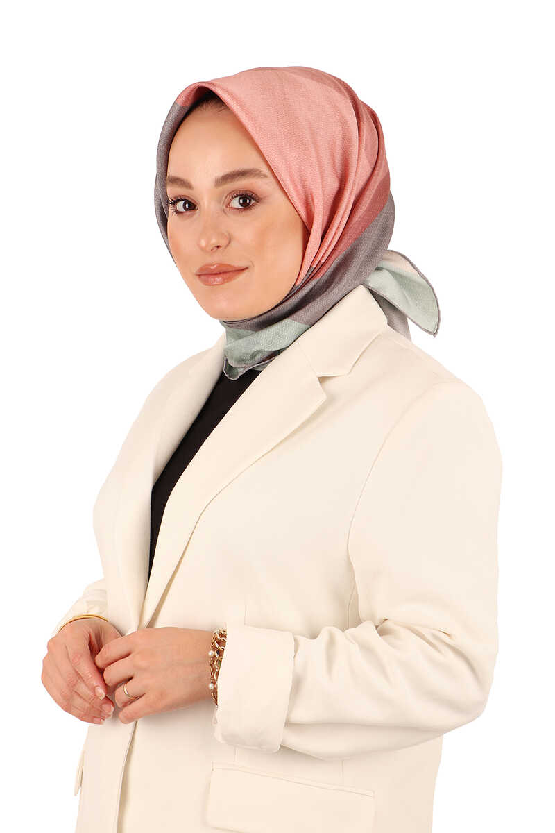 With the Salmon Gray Geometric Pattern Twill Silk Square Scarf, which is reflected in the unique elegance of silk, you will feel the atmosphere of unity in different beauty. Our product; It offers comfort of use with its 100% Silk content and 90x90cm dimensions.