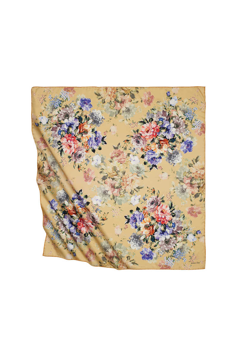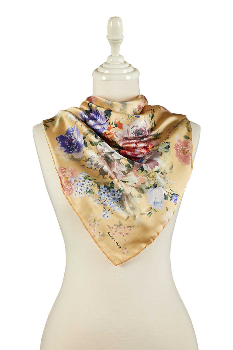Sarı Dörtçiçek Desen İpeksi Eşarp