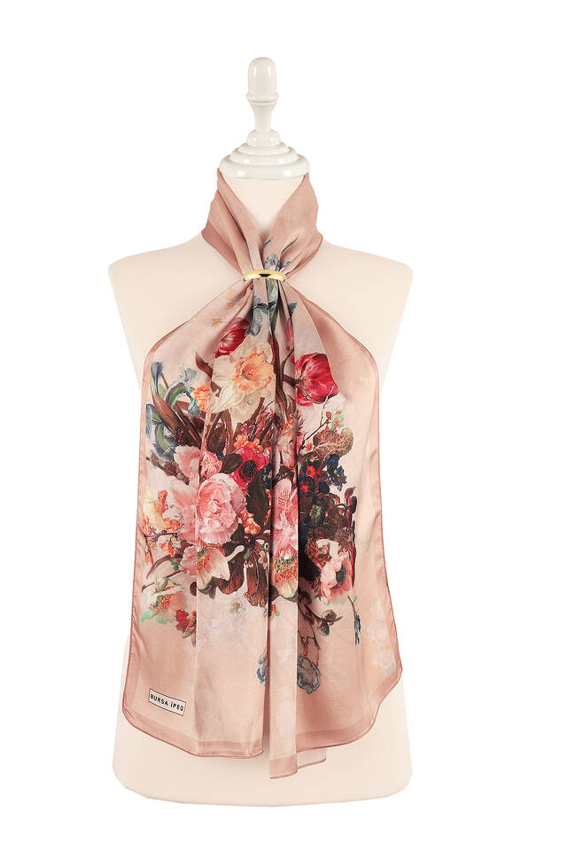 وشاح حرير من الفوال بنقشة زهرة الزنبق باللون البيج