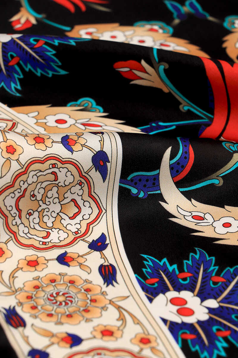 İpeğin eşsiz zarafetine yansıtılmış Siyah Ekru Efes Desen Sura İpek Eşarp ile sizler de farklı güzellikteki bütünlüğün atmosferini hissedeceksiniz. Ürünümüz; %100 İpek içeriği ile 90x90cm boyutlarıyla kullanım rahatlığı sunuyor.