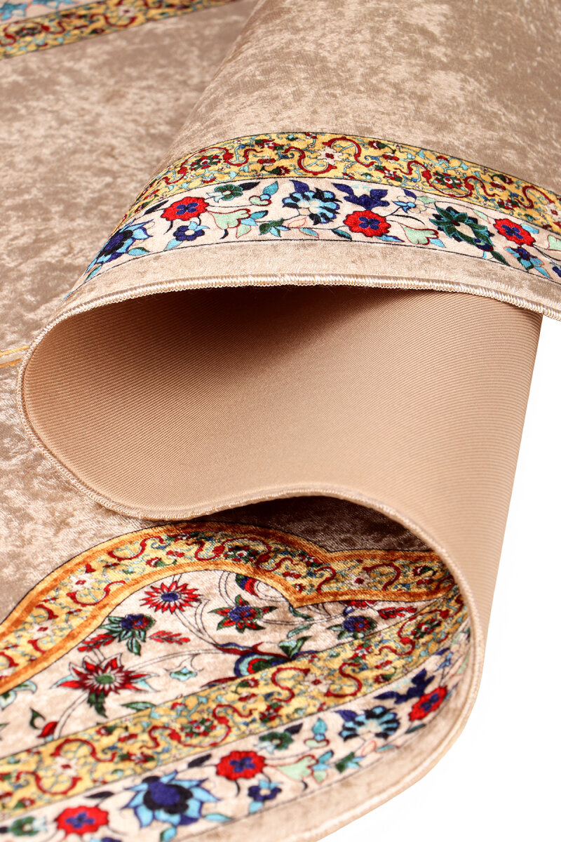 Specially designed to allow you to perform your prayers in peace and comfort, this velvet sponge prayer rug combines elegance and functionality. The high-quality velvet fabric on its upper surface gently touches your skin with its soft texture, while the sponge padding inside provides comfort, even during extended use. Our product, with its velvet fabric and 65 x 115 cm dimensions, offers ease of use.