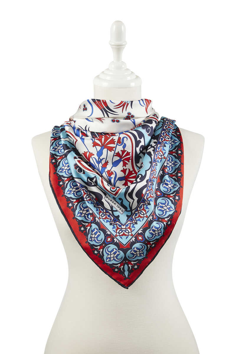Turkuaz Kırmızı Çintemani Karanfil desenlerinin ipeksi kumaş dokusu ile parlak ve canlı renklerle bir araya geldiği eğlenceli ve aynı zamanda klasik bir seçim… Çiçeklerin ipeksi dokuya büründüğü halleri ile hayata enerji katın! Ürünümüz: %100 ipeksi rayon kumaşı, 90x90 cm boyutlarıyla kullanım kolaylığı sunuyor.