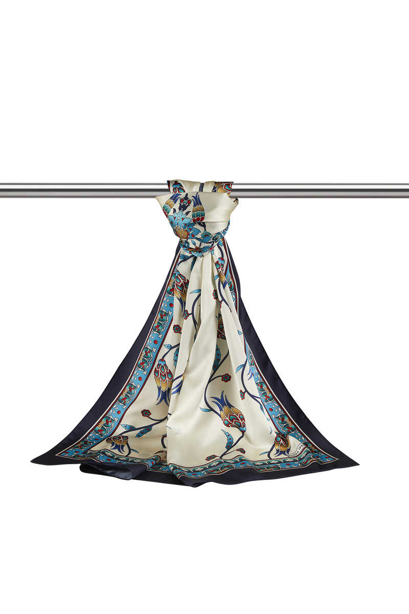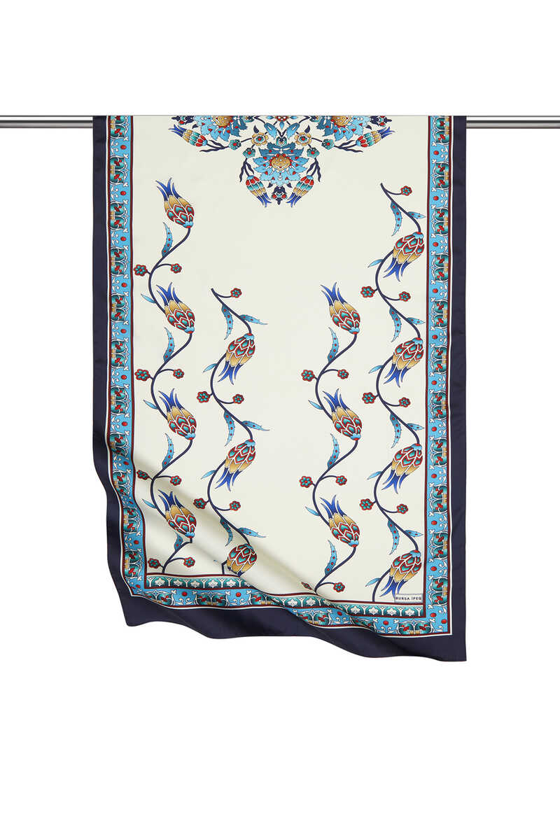 Turkuaz Lacivert Sıra Lale desenlerinin ipeksi kumaş dokusu ile parlak ve canlı renklerle bir araya geldiği eğlenceli ve aynı zamanda klasik bir seçim… Çiçeklerin ipeksi dokuya büründüğü halleri ile hayata enerji katın! Ürünümüz: %100 ipeksi rayon kumaşı, 55x160cm boyutlarıyla kullanım kolaylığı sunuyor.