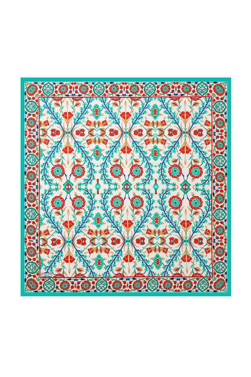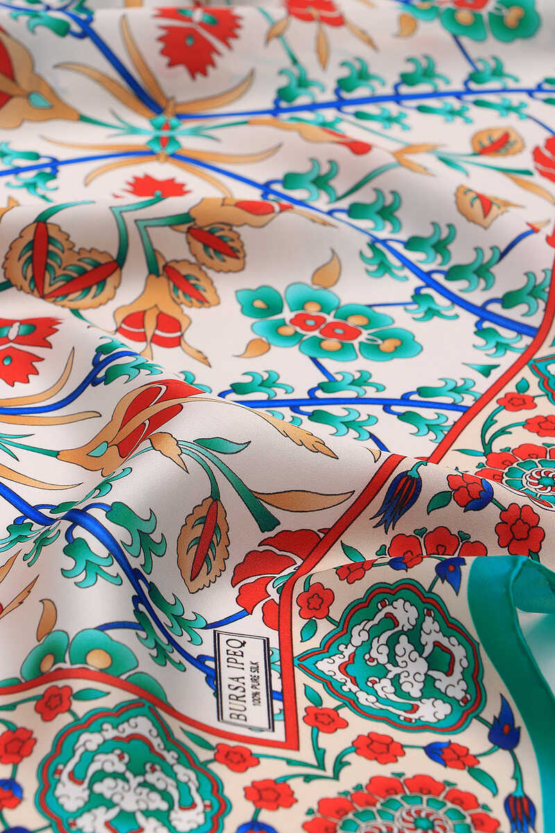 You, too, will feel the atmosphere of integrity in different beauty with the Turquoise Ecru Selçuk Pattern Sura Silk Square Scarf, reflected in the unique elegance of silk. Our product; It offers ease of use with its 100% silk content and dimensions of 90x90cm.
