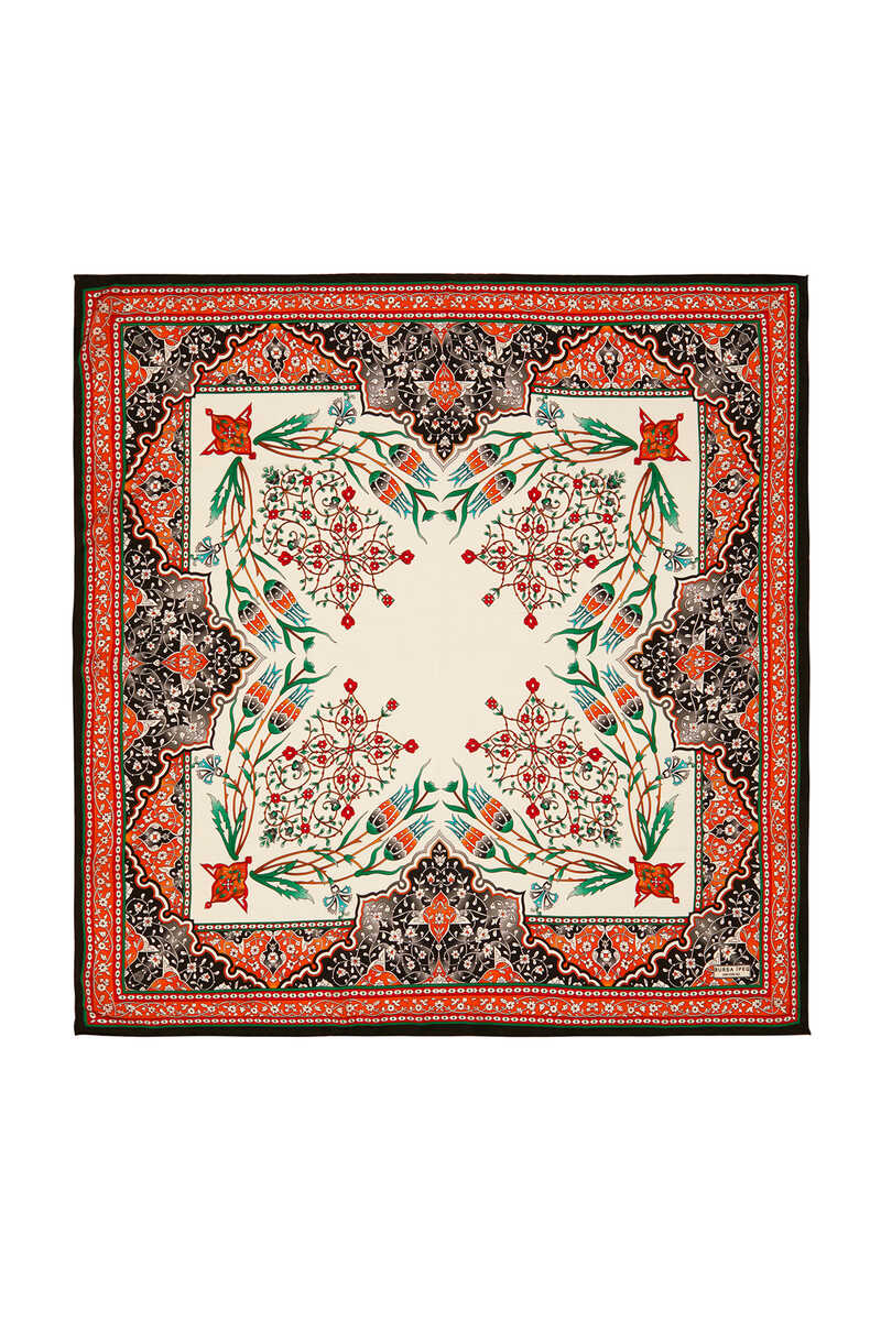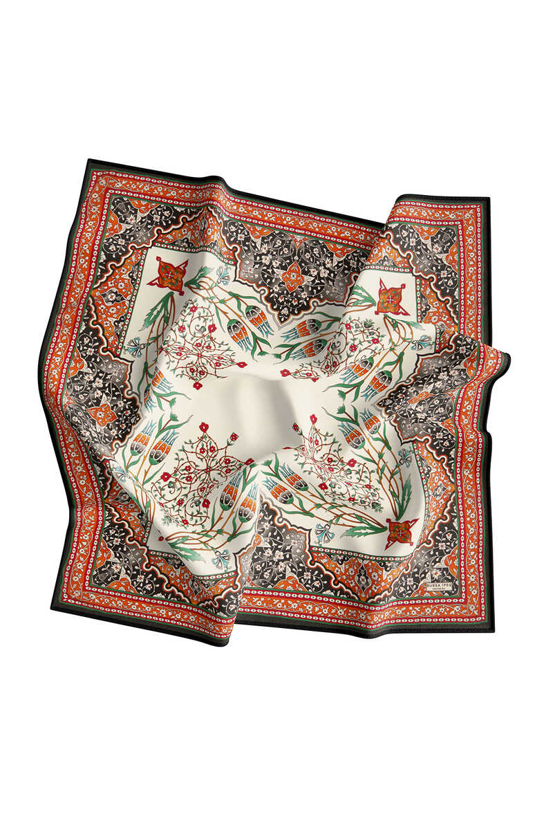 Turuncu Siyah renkli Şamdan Lale deseninin ipek kumaş dokusu ile parlak ve canlı renklerle bir araya geldiği eğlenceli ve aynı zamanda klasik bir seçim… Çiçeklerin ipeğe büründüğü halleri ile hayata enerji katın! Ürünümüz: %100 İpek kumaşı, 90x90cm boyutlarıyla kullanım kolaylığı sunuyor.