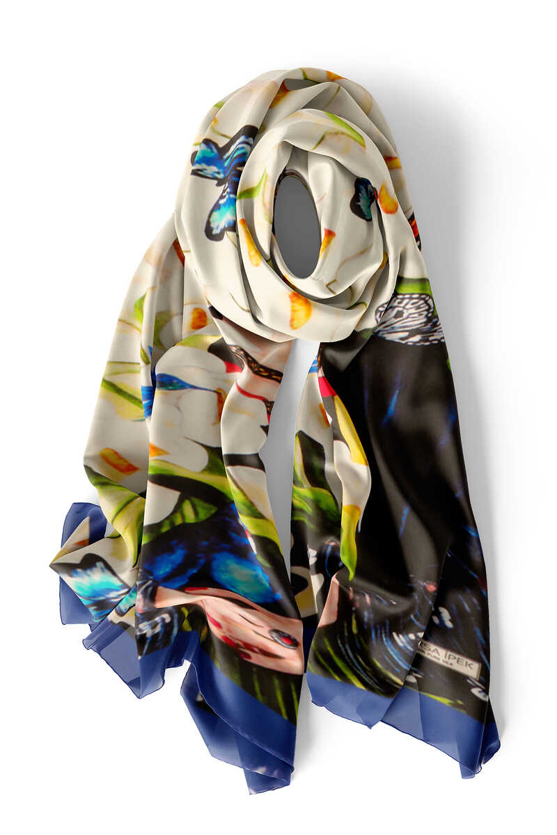 A special model that will complement your style, from the most serious business meeting to the most elegant art gallery, while adding elegance to your elegance. Our Frida Silk Foulard model in white with eye-catching patterns offers ease of use with its 100% silk content and dimensions of 45x165cm.