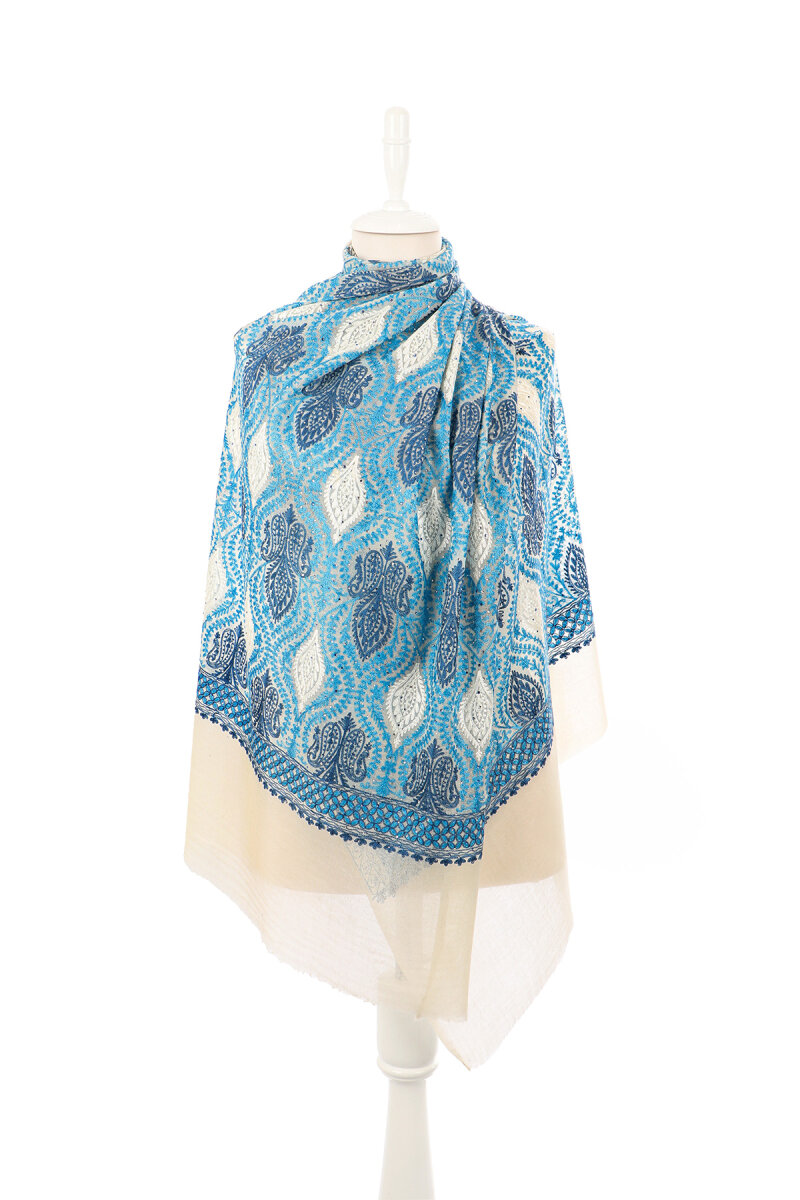 Our Cream-Blue Stone Embroidered Wool-Silk Shawls, carefully crafted to keep you warm on chilly winter days, are sure to captivate with their unique embroidery, stones, and vibrant colors. Made with 90% wool and 10% silk, they measure 80 x 200 cm, making them easy to wear.